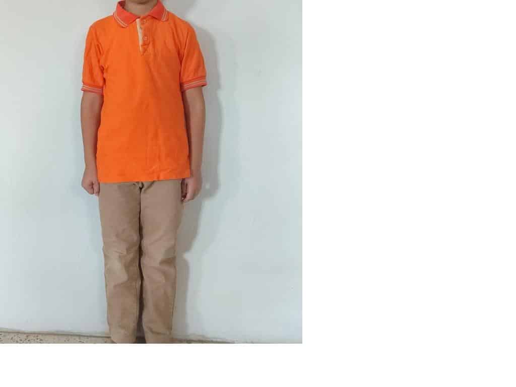 Doğal ve sağlıklı kumaşlardan(pamuklu), polo yaka, kısa veya uzun kollu turuncu renk tişört.(Okul armalı)